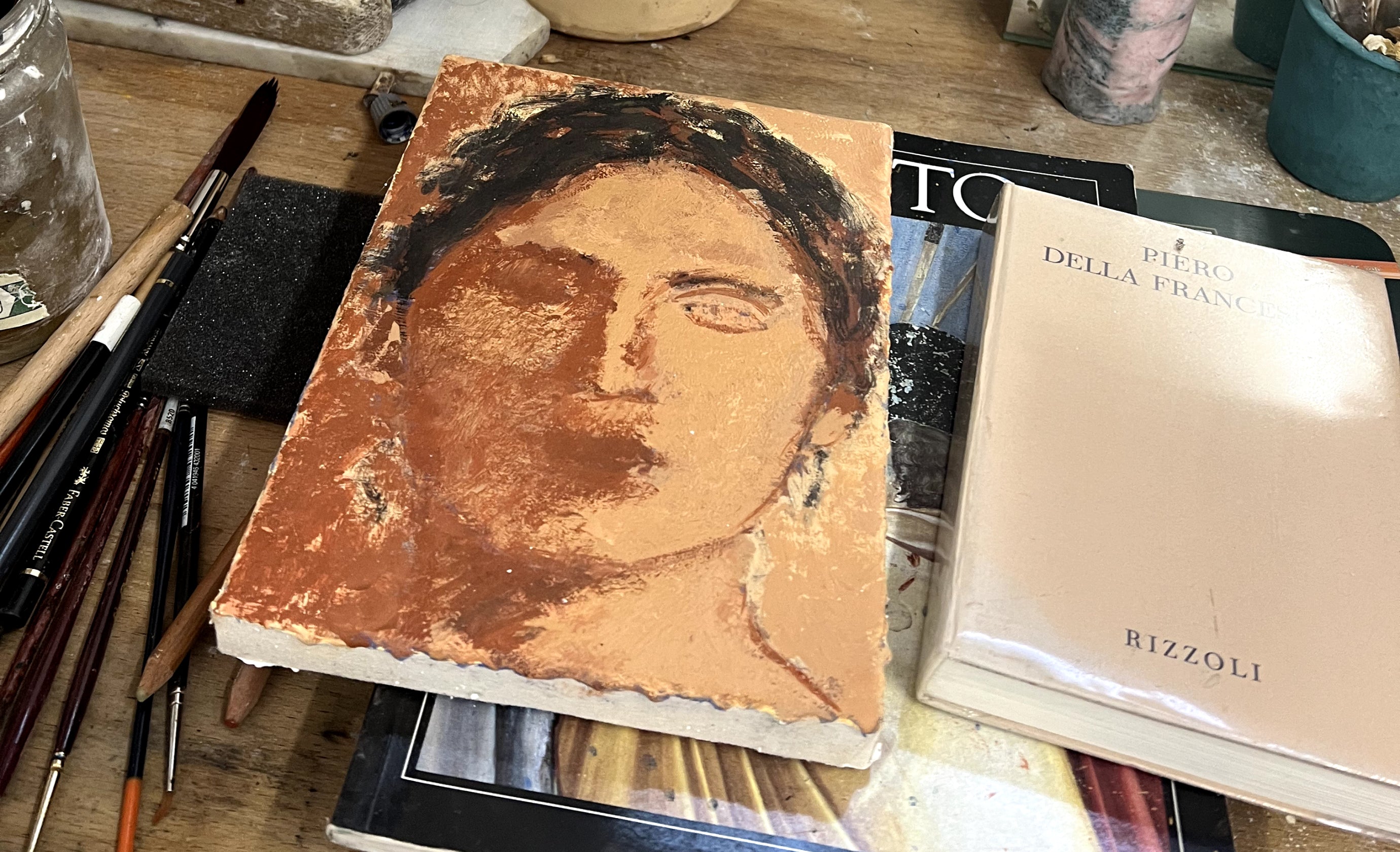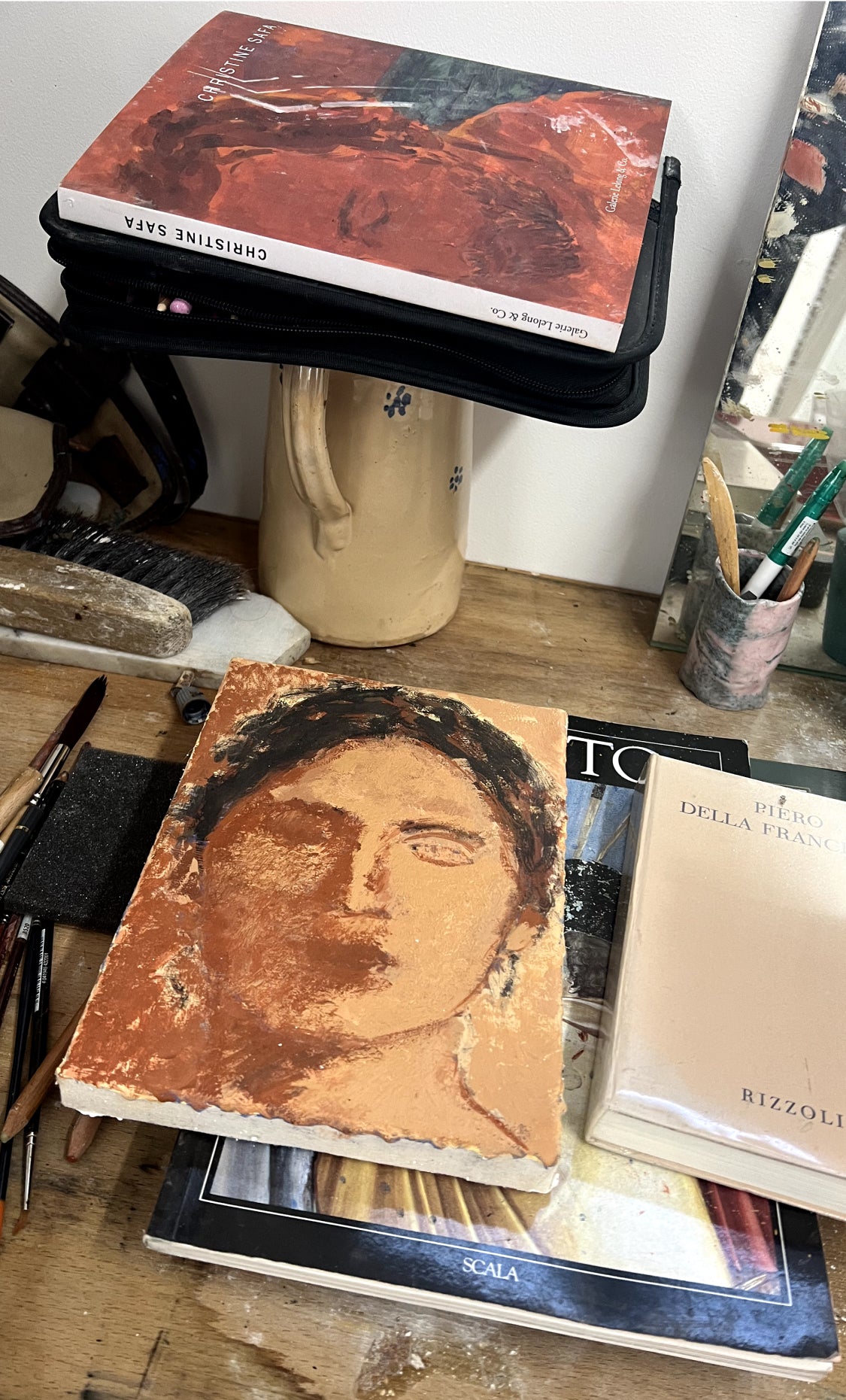 self-portrait in tempera, books by Pierro della Francesca and Giotto,
