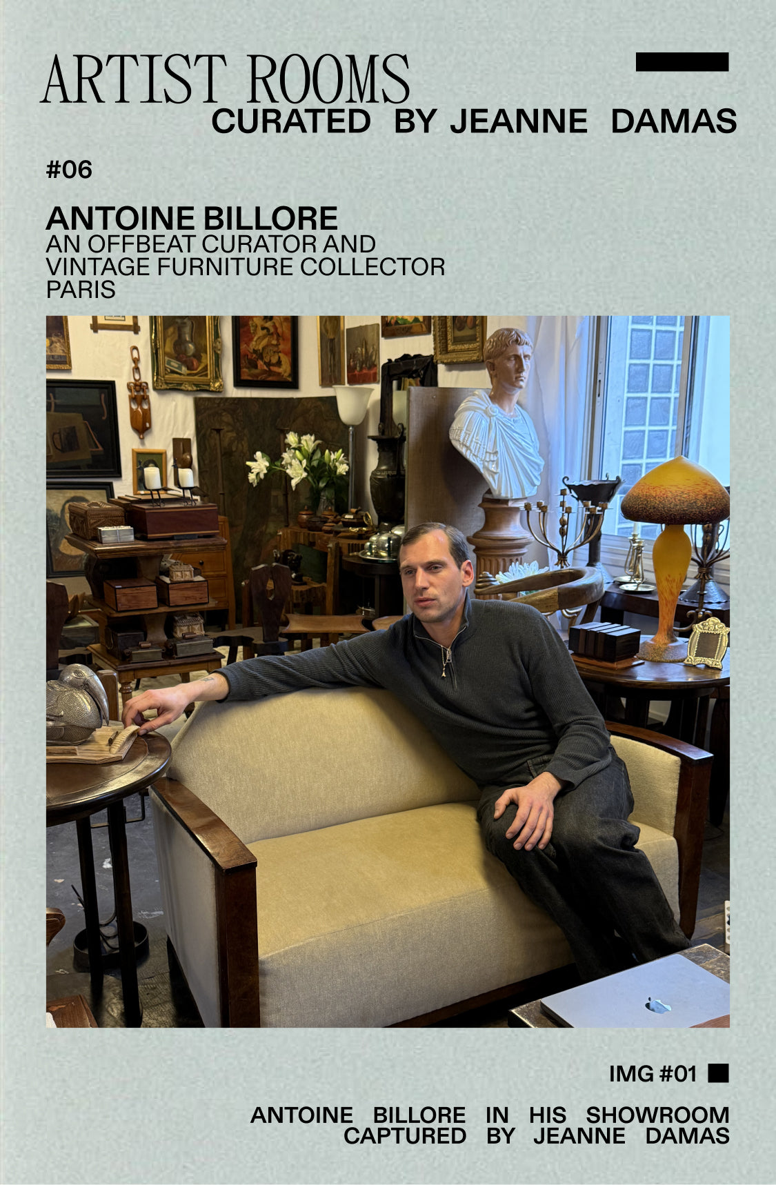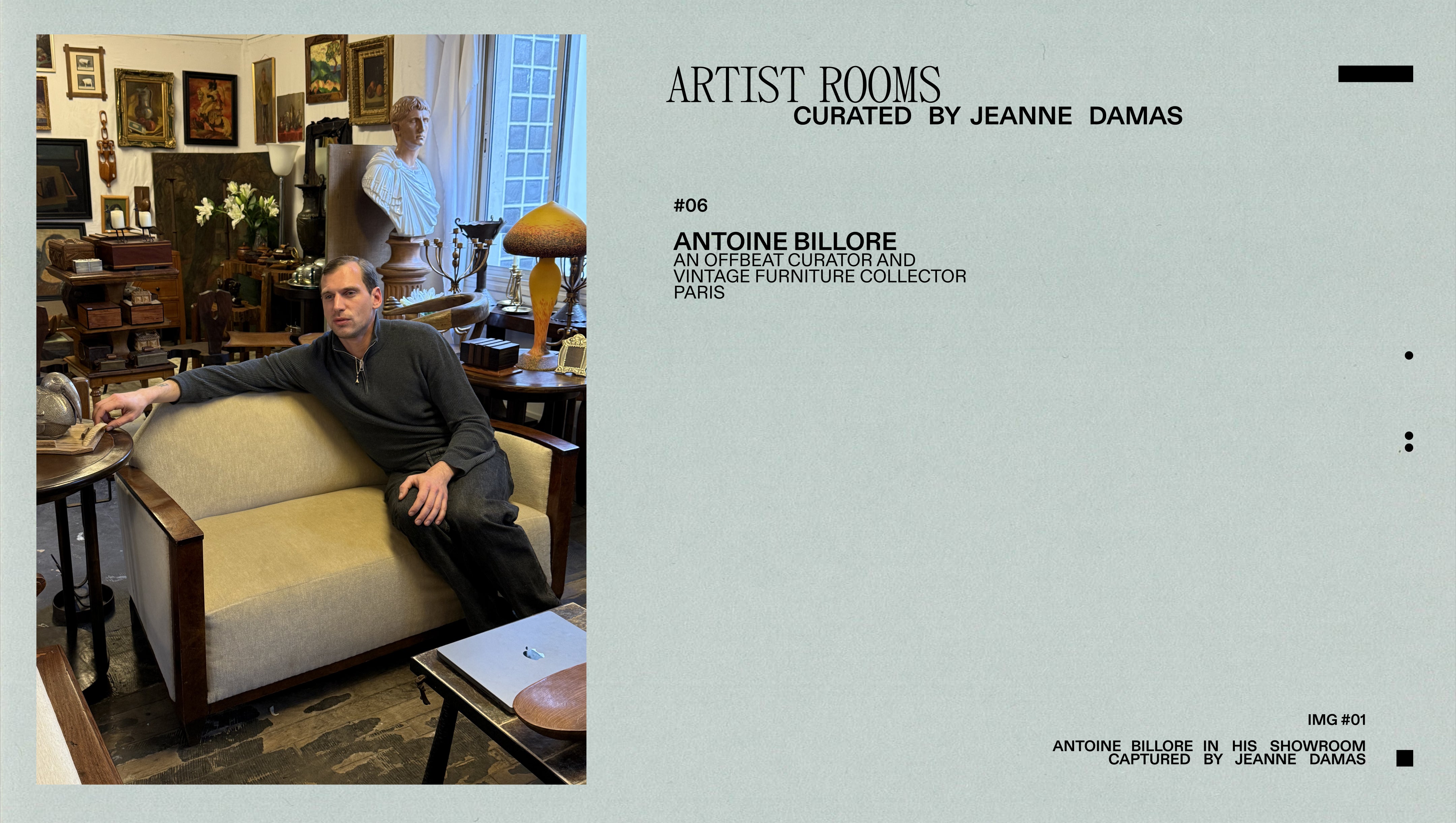 Antoine Billore, antique dealer and vintage furniture hunter, has created a playful and emotional world, where each object tells a unique story. Jeanne Damas met him in his Parisian space — part workshop, part cabinet of curiosities.
