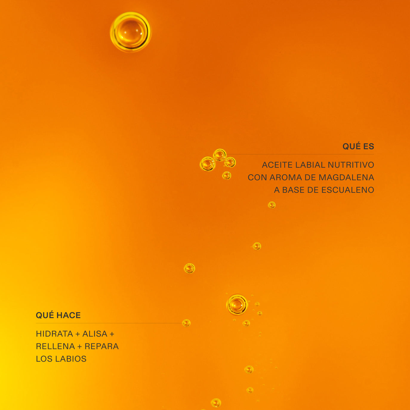 El aceite para labios ultranutritivo actúa en profundidad para ofrecer una reparación intensa, a la vez que ofrece un fantástico efecto volumen. Su acabado brillante aporta un toque radiante y luminoso, y sus notas dulces con aroma a magdalena se funden como un caramelo sobre los labios.Su fórmula altamente natural está enriquecida con escualeno, un ingrediente compuesto por sustancias presentes naturalmente en la epidermis, que hidrata, suaviza y mejora la barrera natural de la piel.