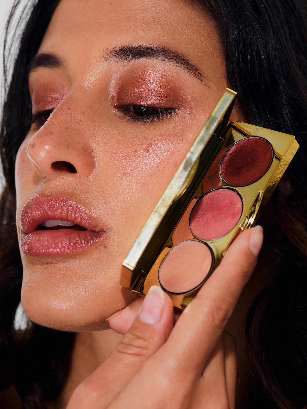 Notre toute première palette pour les yeux dévoile trois nuances pailletées et lumineuses : Nude Irisé, Or Rose et Brun Rouge. Leur texture crémeuse s’applique au doigt ou au pinceau et enveloppe la paupière pour une finition parfaite.Formulées jusqu'à 95% d'ingrédients d'origine naturelle, ces teintes combinent des paillettes fines et subtiles à d’autres plus prononcées et audacieuses. Nichée dans un étui en nacre naturelle inspiré du vintage, les trois teintes sont modulables à l’envie.